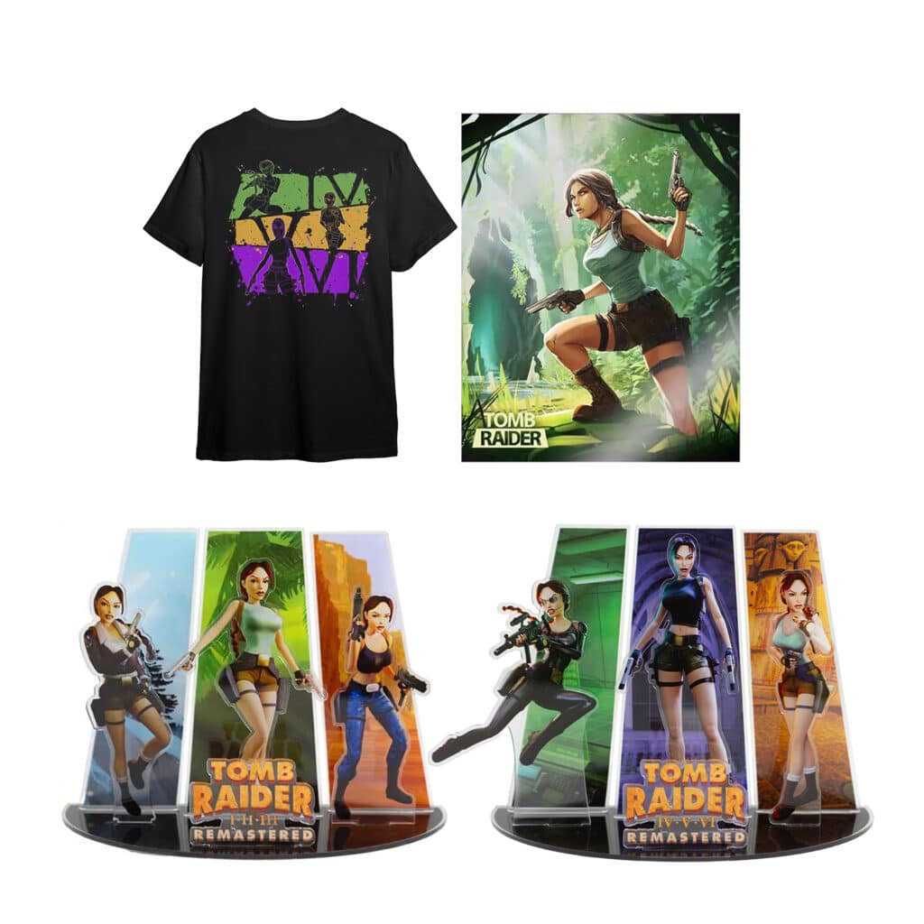 Un t-shirt et un hoodie zippé avec un design tiré du remaster de Tomb Raider 4/5/6 dans le dos (env. 22€ et 44€ HT)