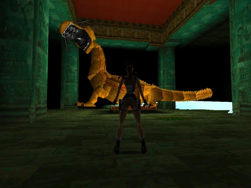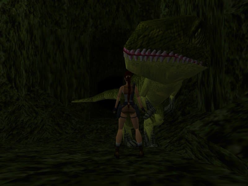 Lara devant le dragon, avec un gros bug d'affichage en arrière plan
